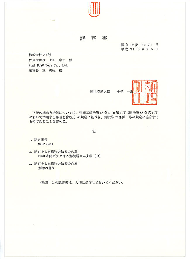 日本国土交通大臣认证证书 2009年9月8日