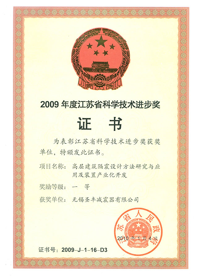 2009年江苏省科技进步一等奖证书