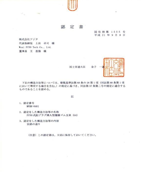 日本国土交通大臣认证证书 2009年9月8日